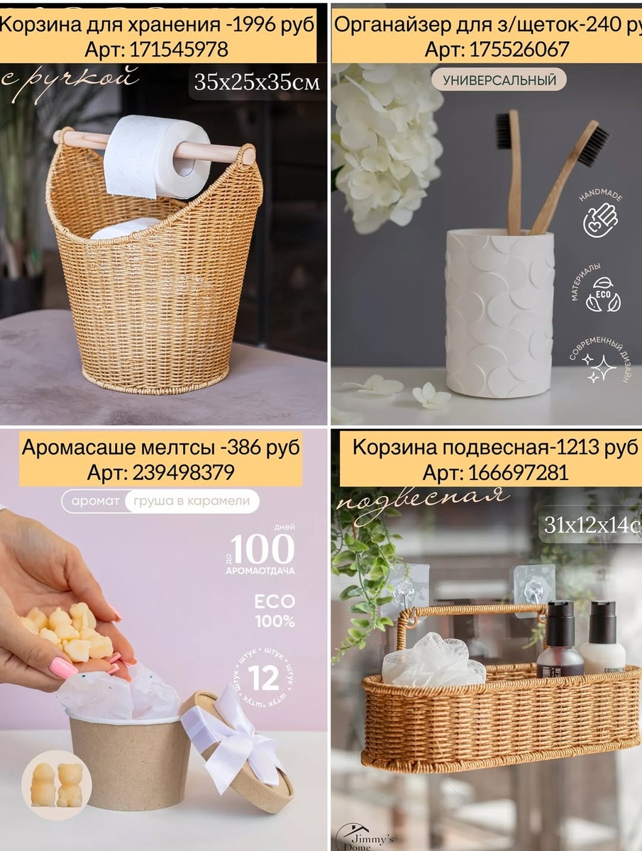 Эта подборка — конструктор уюта. Плетёные корзины формируют порядок и добавляют тёплый акцент, керамика и дерево поддерживают природные фактуры, текстиль делает интерьер мягким, а сервировочные мелочи превращают обычный ужин в событие. Секрет — в повторе материалов и спокойной палитре: дерево к дереву, беж к молочному, стекло к керамике.
