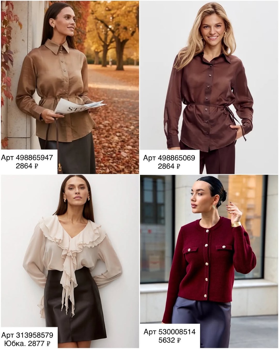 Эта подборка — готовая «винная» капсула сезона. Рубашки из благородного атласа, три вида брюк, два молочных лонгслива, выразительный кардиган и пальто — всё сочетается по цвету и фактуре, создавая десятки комбинаций. Секрет стройности здесь в вертикалях (ряд пуговиц, стрелки, центральные швы), а секрет «дорогого» впечатления — в спокойной палитре и игре фактур: гладкая кожа, мягкое букле, матовый атлас.
