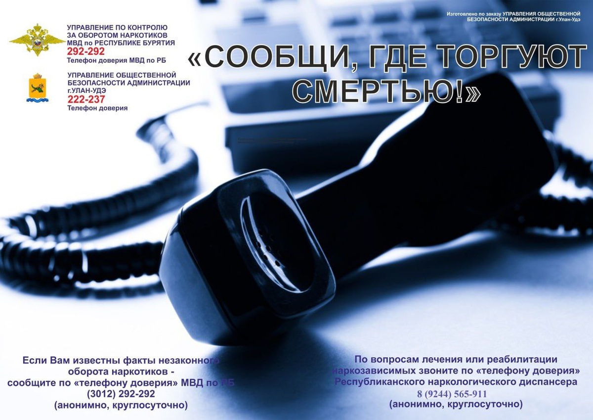 ⭐️ В Бурятии стартует второй этап Общероссийской акции «Сообщи, где торгуют смертью!» 🌍 Акция проводится традиционно с целью привлечения общественности к участию в противодействии незаконному обороту и потреблению наркотиков, организации работы по приему оперативной информации, консультации и оказания помощи гражданам, обращающимся с вопросами лечения и реабилитации наркозависимых. 🗓 Второй этап акции пройдет с 13 по 24 октября. 📱 Сообщить информацию о фактах незаконного оборота наркотиков граждане могут по телефону «102», а также в дежурные части территориальных органов МВД России, подчиненных МВД по Республике Бурятия. Все звонки принимаются круглосуточно и на анонимной основе. ☎️ Также звонки и обращения граждан готовы принять врачи и специалисты Республиканского наркологического диспансера по «телефону доверия» 8 (924)456-59-11.
