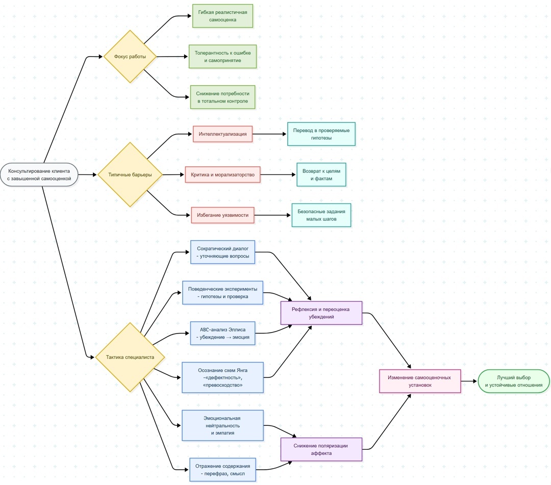 Психологу нередко приходится консультировать людей, которые на первый взгляд уверены в себе, категоричны в суждениях и склонны занимать доминирующую позицию в общении. Однако за внешней самоуверенностью может скрываться уязвимость, тревога и потребность в признании и др. Иногда завышенная самооценка - это не столько избыток уверенности, сколько механизм защиты от внутренней неуверенности и страха неадекватности. Одной из особенностей таких людей может являться страх признания ошибок. Ошибка может восприниматься как поражение, а не как источник развития. В глубине личности может сохраняться зависимость от оценки, но внешне она подается как независимость и гордость. Одна из стратегий работы с такими клиентами может строиться на сочетании уважительного принятия личности и структурирования высказываний. Клиенту с завышенной самооценкой может быть важно чувствовать, что его слушают, но при этом психолог не должен терять свою позицию. Работа может заключаться в следующем: Сократический стиль