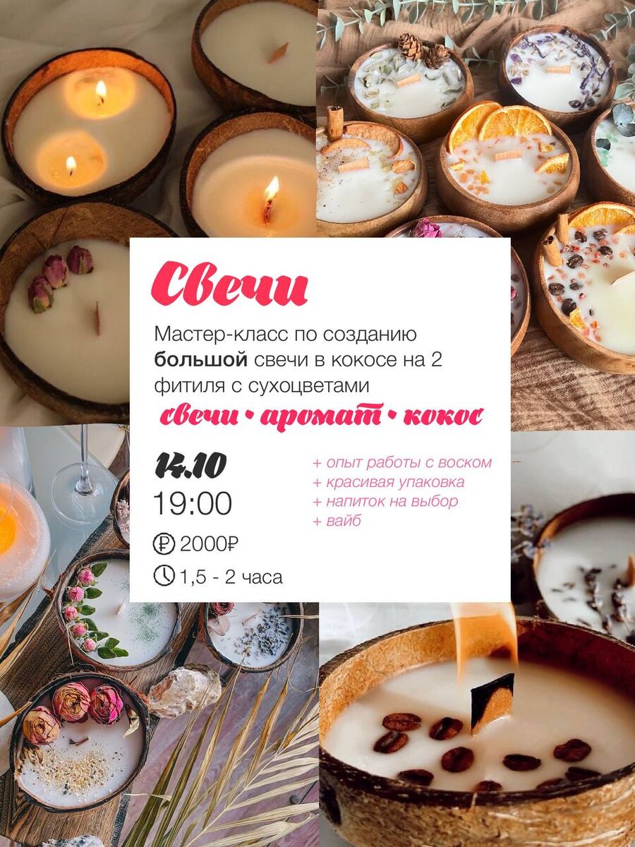Сегодня арт-лаборатория «Фитиль» приглашает на мастер-класс по созданию большой свечи в кокосе Предлагают выбрать ароматы и сухоцветы и погрузиться в магию свечеварения 🕐14 октября 19:00 📍Выставочная, 10 🪙2000₽ Для компаний от 3х человек скидка 10% 🔑по всем вопросам и записи: @art_fitil #Новости Предложить публикацию:@zabkulisye_bot