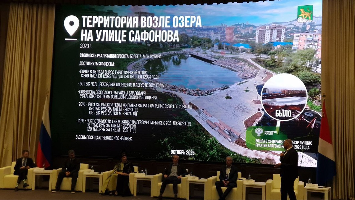 Озеро на Сафонке - главный акцент в слайде главы города в рамках презентации развития общественных пространств на парковом форуме, который проходит сегодня в здании правительства края.