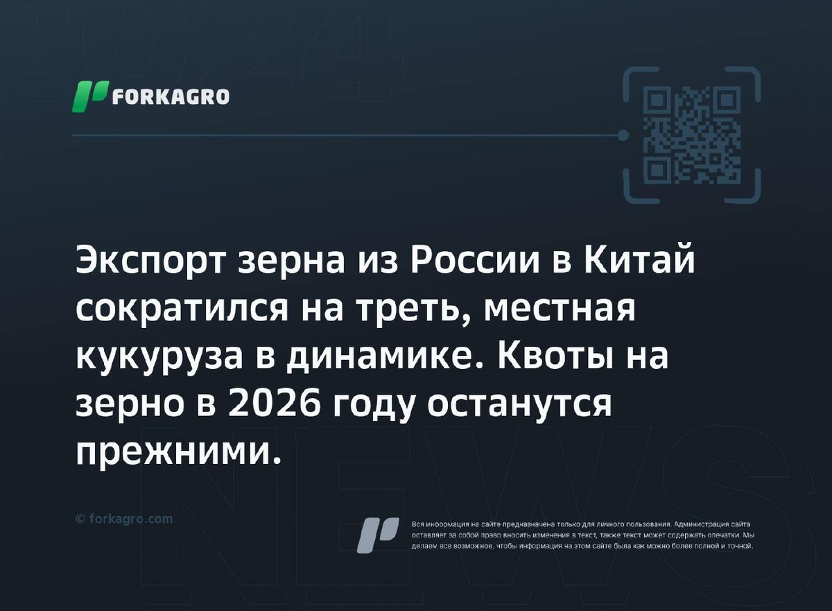 Экспорт зерна из России в Китай сократился на треть, местная кукуруза в динамике. Квоты на зерно в 2026 году останутся прежними. Начиная с октября, экспорт российского зерна в Китай уменьшился до 1 млн тонн, на треть меньше, чем годом ранее. Поставки кукурузы увеличились в 3 раза, достигнув 300 тыс. тонн с начала 2025 года. Квоты на импорт зерновых в 2026 году останутся на текущем уровне. Россельхознадзор обновил процедуры доступа китайского рынка для продуктов переработки зерна. Перейти к источнику