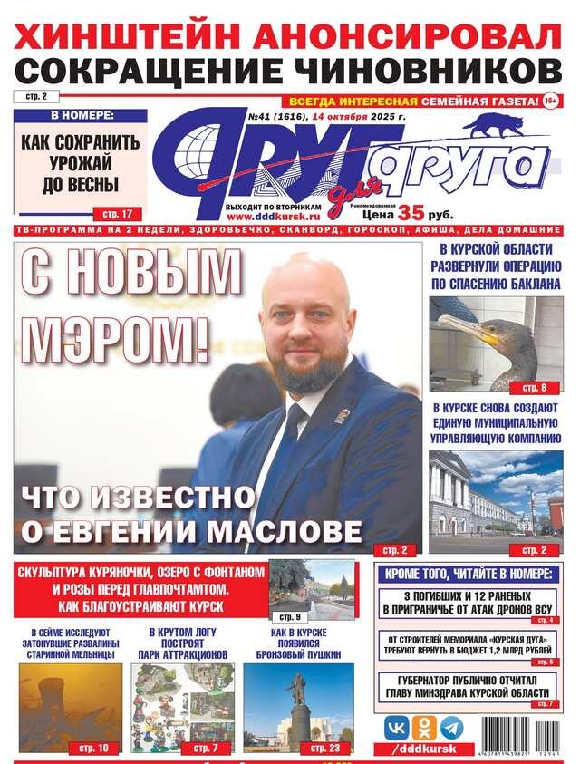 Во вторник, 14 октября, вышел в свет свежий номер всегда интересной семейной газеты «Друг для друга» — одного из самых популярных и читаемых печатных изданий Курской области. Из него вы можете узнать следующее. • Главой Курска стал Евгений Маслов. Что известно о новом мэре. • Хинштейн анонсировал сокращение чиновников. • В Курской области развернули операцию по спасению баклана. • В Курске снова создают единую муниципальную управляющую компанию. • Жуткая авария под Фатежом унесла две жизни. • Трое погибших и 12 раненых в приграничье Курской области от атак дронов ВСУ. • В реке Сейм исследуют затонувшие развалины старинной графской мельницы. • В Крутом Логу построят Парк аттракционов. • В Железногорске уволился главный врач горбольницы. • От строителей мемориала «Курская дуга» требуют вернуть в бюджет 1,2 миллиарда рублей. • Как в Курске появился бронзовый Пушкин. • Губернатор публично отчитал главу минздрава Курской области. • Курское «Динамо» громит соперниц. • Продолжается подписка н