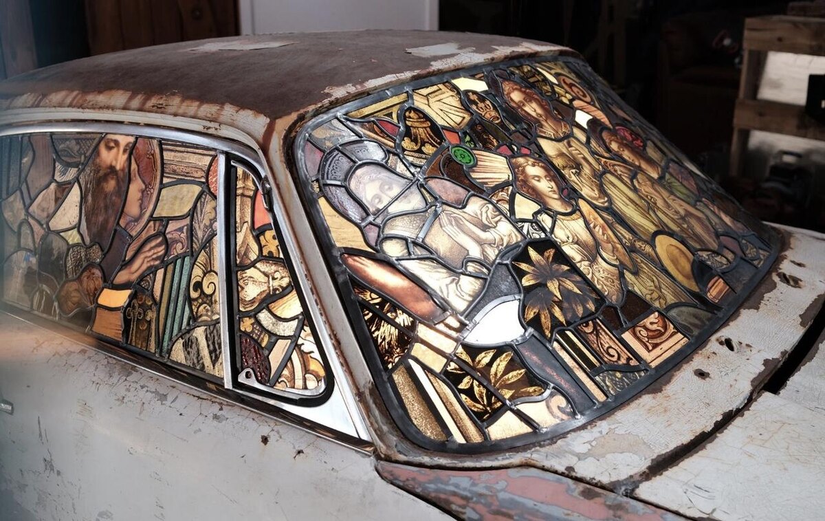 Кузов старого Porsche полностью лишен колес, окон и интерьера — осталась лишь «скелетная» основа, на которую Бен установил вручную изготовленные витражные окна. Для работы он использовал технику, вдохновленную готическими соборами Европы, где цветное стекло играло роль не только декоративного элемента, но и источника особого священного света. Витражи Туны содержат изображения ангелов, святых с нимбами и другие религиозные мотивы, что придает инсталляции глубину символизма и создает атмосферу духовного пространства. Технология изготовления витражей — сложный и кропотливый процесс