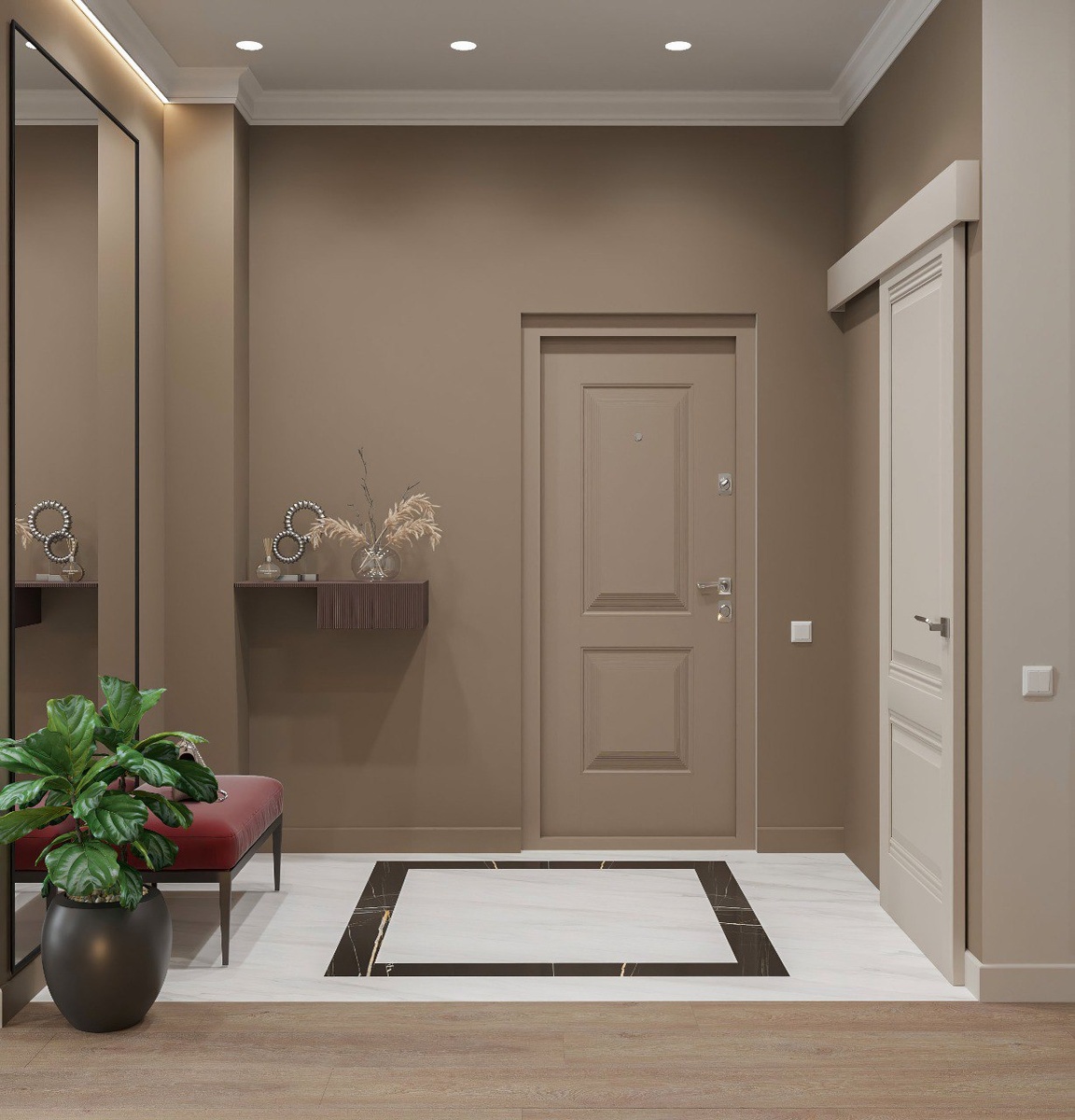 В этом интерьере я решила использовать серо-коричневые тона для создания глубины и стиля в прихожей. Для дополнения композиции я выбрала консольный столик чёрного цвета с золотыми ножками. Дверь в тон стен с серебристой ручкой стала гармоничным переходом между прихожей и остальной частью дома. Я уделила особое внимание сочетанию цветов и материалов, чтобы создать единый и продуманный образ. Справа от столика я разместила бордовый диванчик с чёрными ножками. Для добавления свежести и естественности я разместила рядом с диванчиком растения в тёмных горшках. Стены я окрасила в бежевый цвет, который создаёт уютную и спокойную атмосферу. Молдинги и карнизы придают пространству элегантность и утончённость. Пол выложен светлой плиткой с тёмными вставками. Это решение также способствует визуальному расширению пространства. Я выбрала точечные светильники для равномерного освещения и добавила длинную чёрную лампу, которая создаёт мягкий и уютный свет. #project_gd #mop_gd