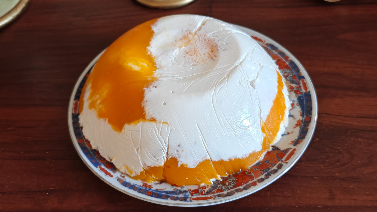 Нередко меня посещает вдохновение, и я начинаю колдовать на кухне. Колдунья из меня вполне себе приличная – близкие довольны и счастливы. Вот и на этот раз загорелась, посмотрев аппетитное видео с приготовлением десерта без выпечки. Какая девочка ( неважно, сколько ей лет! 😁) не мечтает о таких вкусняшках... Уж сколько в видео было ахов, охов и прочих восторгов по поводу этого десерта! Автор смаковала и так, и эдак, подвигнув меня в итоге на маленький вечерний подвиг. Для изумительного вида тортика надо взять в равных долях тыкву и творог, тыкву сварить, всё по-отдельности взбить с сахаром, добавить расплавленного желатина, сок и цедру половинки лимона. На четыре часа поставить в холодильник – и вуа ля. Вместо сахара я добавила мёда и совсем немного яблочного варенья, поскольку сахар в чистом виде стараюсь не использовать. Делала вкусняшку поздно вечером – дегустировать пришлось сегодня утром. Засыпа́ла в хорошем настроении и проснулась в предвкушении. Кофеёк наполнил дом н