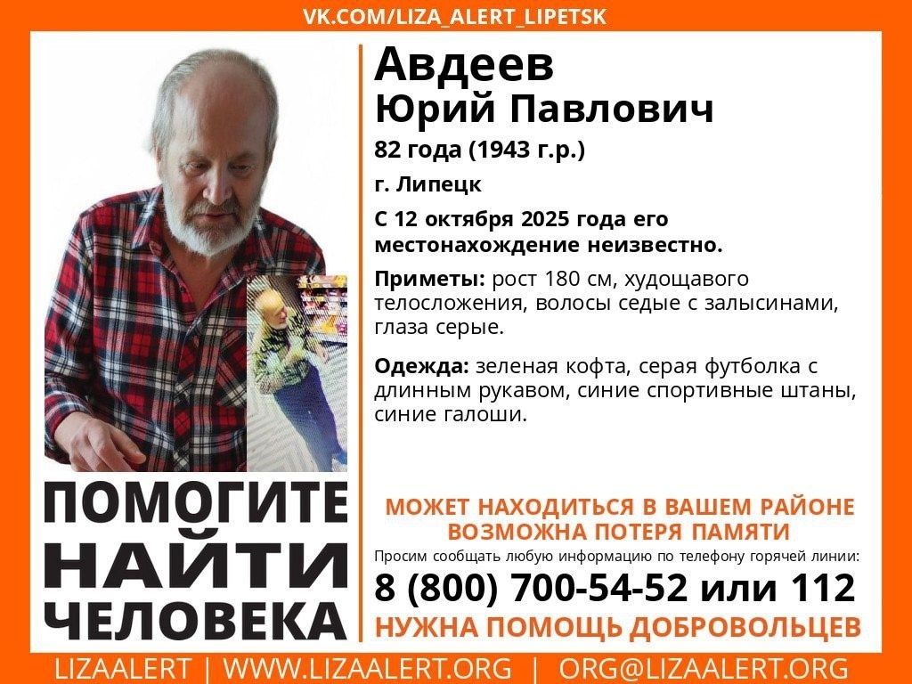 В Липецке с 12 октября волонтеры и полиция разыскивают 82-летнего Юрия Авдеева. Пенсионер ушел из дома и не вернулся назад.