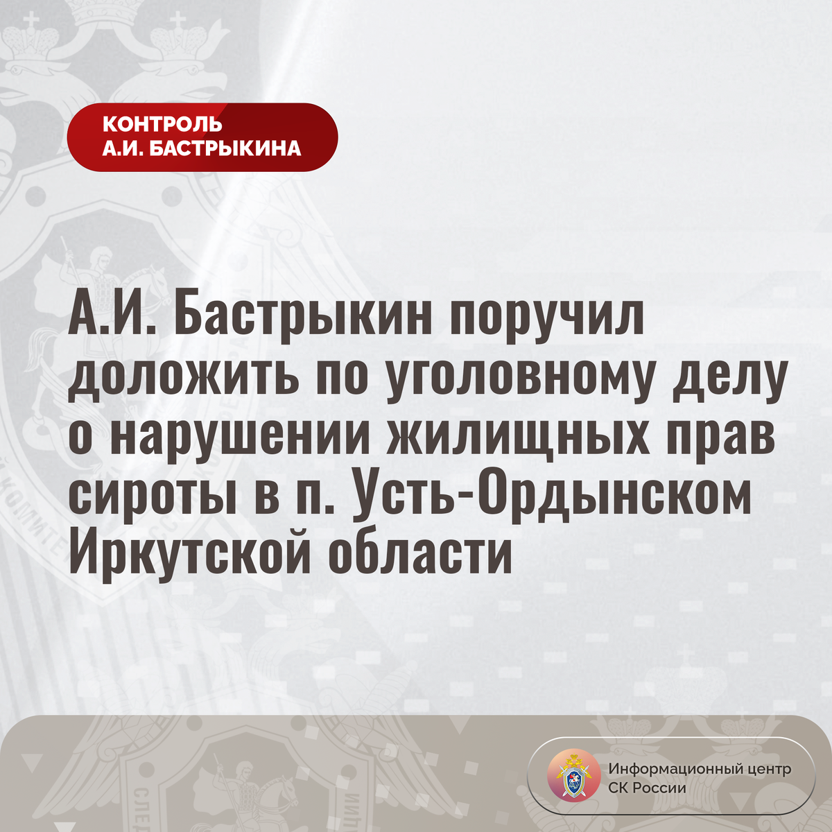 А.И. Бастрыкин поручил доложить по уголовному делу о нарушении жилищных прав сироты в п. Усть-Ордынском Иркутской области В Информационный центр СК России обратился сирота из поселка Усть-Ордынского Иркутской области по вопросу непредоставления ему положенного по закону жилья. С 2019 года мужчина состоит на учете лиц, подлежащих обеспечению жилыми помещениями. До настоящего времени его права не реализованы. Многочисленные обращения в различные инстанции результатов не принесли. В СУ СК России по Иркутской области по поступившему обращению возбуждено уголовное дело. Председатель Следственного комитета Российской Федерации Александр Иванович Бастрыкин поручил руководителю СУ СК России по Иркутской области Анатолию Викторовичу Ситникову доложить о ходе и результатах расследования уголовного дела. Исполнение поручения поставлено на контроль в центральном аппарате ведомства. #СледственныйКомитет #СКРоссии #СКР #ИЦСКР #ИнформационныйЦентр #АлександрБастрыкин #ПредседательСКР #КонтрольПредсед