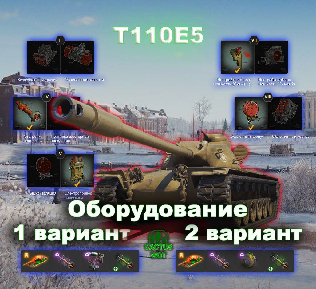 🇺🇸T110E5 ⚗️Тяжелый танк универсальный 10 уровень. 🚀Оборудование и полевая модернизация на скрине. ➕Плюсы танка хорошее лобовое бронирование; хорошая динамика; отличное орудие — точное, скорострельное, бронебойное, с быстрым сведением; хороший потенциальный урон в минуту; отличная точность при стрельбе с ходу; компактный корпус (6 катков, как у средних танков); высокая скорость поворота башни и танка. ➖Минусы танка крайне слабое бронирование кормы и бортов; уязвимая боеукладка; низкий разовый урон. Нужно больше инфы? ⬇️⬇️⬇️⬇️⬇️⬇️⬇️⬇️ #базазнаний@CactusWOT #T110E5@CactusWOT #миртанков
