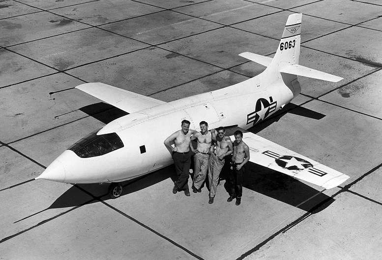 Преодоление звукового барьера стало важной задачей конструкторов после изобретения реактивного двигателя. Решение требовало новых подходов к конструкции самолетов. Это стало задачей в 40-х годах прошлого века и мировая война стала толчком к таким исследованиям. Экспериментальный самолет с ракетным двигателем Bell-X1 был построен в США в 1946 году специально для этой цели. Пробный полет самолет совершил в декабре того года. 14 октября 1947 года состоялся первый полет суперджета со сверхзвуковой скоростью 1.06 маха. За штурвалом был летчик-испытатель ВВС США Чак Йегер. Первая модификация самолета носила игривое название Glamorous Glennis. Именно на ней был поставлен рекорд скорости. На заглавном фото вверху более поздняя модификация Bell-X1. Чарльз Йегер испытывал самолёт постепенно увеличивая нагрузки, потому что преодоление скорости звука тогда было изучено только теоретически. Аэродинамическое сопротивление становится так велико, что изменяется обтекание воздухом, нагрев и поведение м