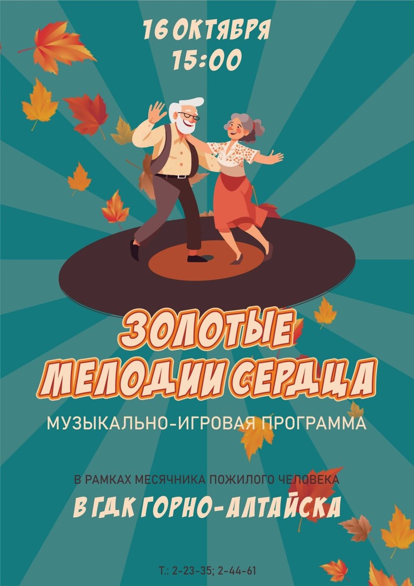Приглашаем на музыкально-игровую программу «Золотые мелодии сердца»! 🎵 Дорогие друзья, уважаемые ветераны и люди золотого возраста! В рамках Месячника пожилого человека Городской Дом культуры Горно-Алтайска приготовил для вас особенный, душевный подарок! Приходите 16 октября в 15:00 в наш уютный зал, чтобы: • Окунуться в ностальгию и спеть любимые песни своей молодости. • Блеснуть эрудицией в веселых викторинах и музыкальных конкурсах. • Пообщаться в теплой компании прямо на празднике. • Вспомнить молодость и зарядиться отличным настроением! Ждем вас в ГДК, чтобы вместе наполнить этот осенний день теплом, музыкой и улыбками! 🎉Дата: 16 октября ⏳Время: 15:00 ‼️Место: Городской Дом культуры (ул. Социалистическая, дом 24). 6+ Вход свободный. Не забудьте взять с собой хорошее настроение!