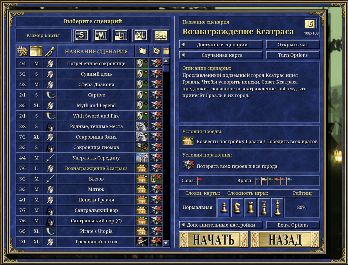 Когда я ещё играл в школьное время, после трудной учебной недели любил запустить карту размера L или XL, чтобы играть до ночи, а потом ещё и допроходить на следующий день. Тогда времени было вагон и целая тележка. Сейчас же я чаще всего отдаю предпочтение маленьким картам (как, впрочем, и в «Героях 4»), которые можно стремительно пройти максимум за несколько часов, а лучше за пару. Иногда позволяю себе среднюю, если понимаю, что впереди имеется определённая сумма безмятежных часов. Вообще, есть в маленьких картах какой-то особый шарм и ограничения, которые заставляют вас устраивать молниеносное развитие и стремительные атаки. На громадных картах, типа H или G, вроде бы ни разу ещё не играл, но планирую попробовать, как это.