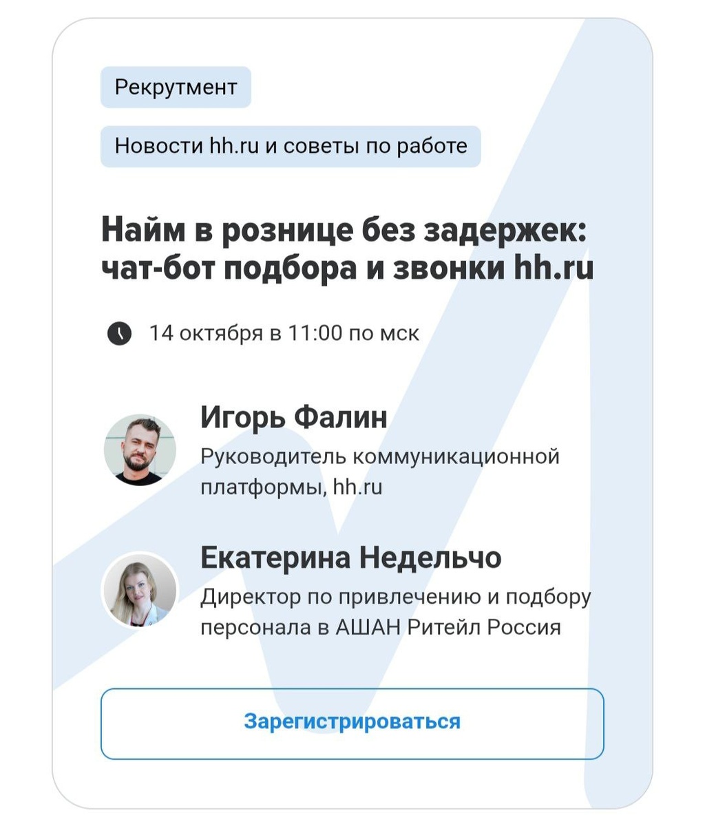 Привет, друзья 👋 💻 Сегодня участвую в вебинаре "Найм в рознице без задержек: чат-бот подбора и звонки hh.ru" 🗓 14 октября, 11:00 по Москве, онлайн На вебинаре расскажем, как находить подходящих и заинтересованных кандидатов с помощью чат-бота подбора hh.ru и быстрее связываться с ними через звонки и чат. ➡️ Регистрация тут https://expert.hh.ru/webinar/96128914