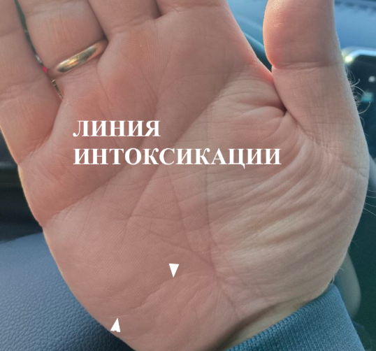 Из второстепенных линий - Линия Интоксикации встречается чаще всех, что не удивительно, ведь в современном мире причин этому предостаточно . Многие хироманты связывают эту линию с экстраординарными способностями, что в корне не соответствует реальности. Хочу напомнить, что ладонь отражает не только психологический портрет человека и события, но , в первую очередь, состояние физического тела и души человека. Генетики изучают наши руки с точки зрения именно здоровья, предлагаю с этой позиции данную линию и рассмотреть, что подтверждается на практике 100%. Названий у этой линии много - ЛИНИЯ ЯДА,ИНТОКСИКАЦИИ, ПЕЧЕНИ, НЕПТУНА, СЛАДОСТРАСТИЯ, VIA LASCIVIA. Дадим ей определение. Это горизонтально ориентированная линия, начинающаяся с Холма Луны или Холма Плутона, пересекающая ладонь в проекции зоны печени и ЖКТ и направленная к Линии Жизни (Холму Венеры). Опасным для жизни является момент, когда данная линия пересекает Линию Жизни, не стоит этого дожидаться, принимая меры по оздоровлению,