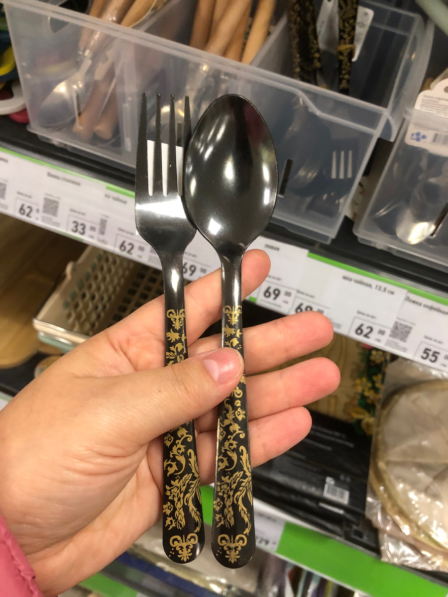 Посмотрите, какие привезли столовые приборы. В наличии есть ложки, вилки и чайные ложечки. Цена 69 рублей. Материал: нержавеющая сталь.