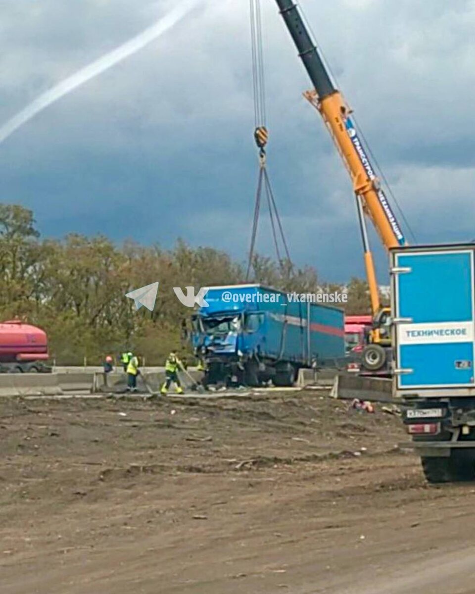 В ответ на пост Вот так вчера с помощью грузоподъемного крана вытягивали грузовик, который влетел в отбойник на трассе М-4.