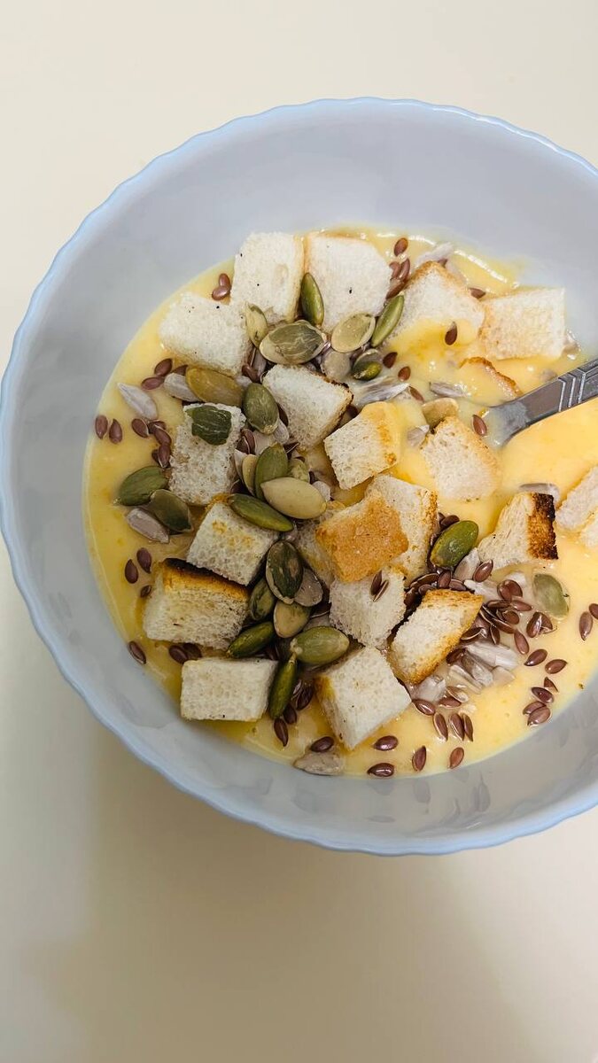 Ингредиенты: Приготовление: Чистим и крупно режем овощи. Варим до готовности. Сливаем почти весь бульон и пюрируем. Добавляем сливки (10 или 20%). Доводим до кипения и выключаем. При подаче посыпаем сухариками и семечками.