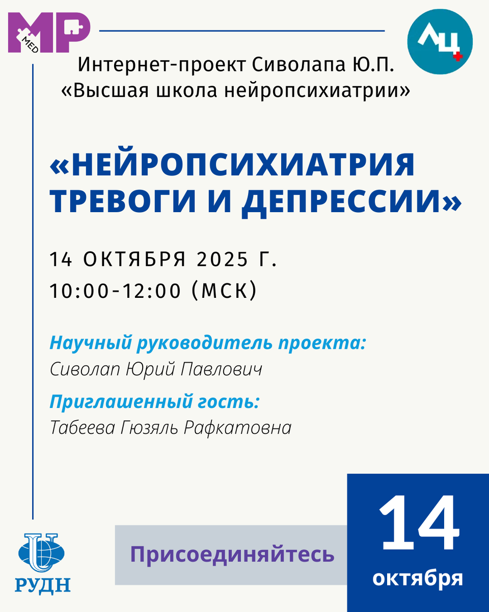 Уважаемые коллеги, приглашаем Вас к участию в интернет-проекте Сиволапа Ю.П. «Высшая школа нейропсихиатрии» «Нейропсихиатрия тревоги и депрессии»