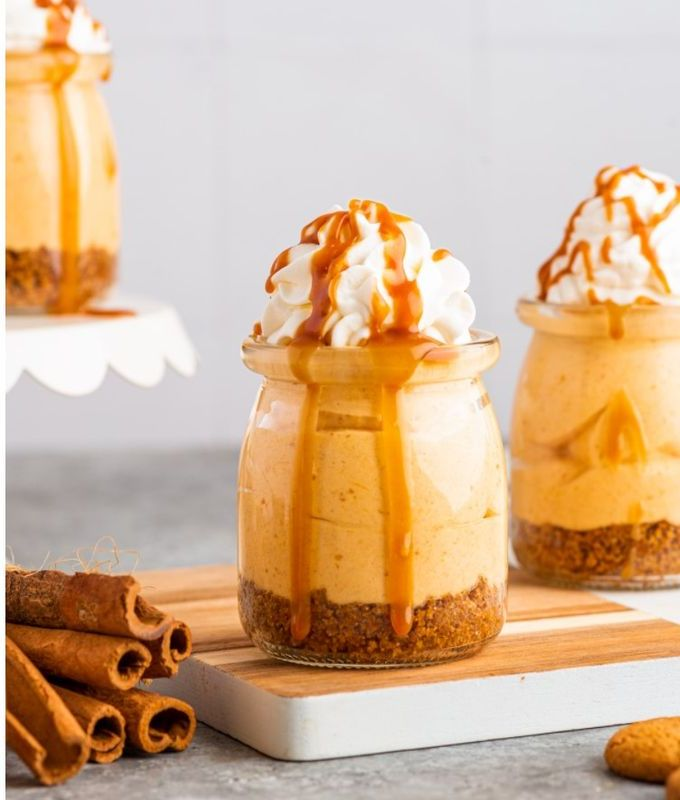Самое сложное в приготовлении этого десерта — дождаться, пока он охладится. Ведь он получится таким аппетитным, что его захочется немедленно попробовать. дополнительно: порционные стаканы сотейник (ковшик) "погружной" блендер и измельчитель "планетарный" миксер кондитерский мешок с насадкой "звездочка" Ингредиенты (комнатной температуры) и приготовление: 1 этап: готовим тыквенное пюре Тыквенное пюре — 300 гр. тыкву очищаем, нарезаем и запекаем в духовке можно отварить тыкву Если у вас тыква свежая, то варите (или выпекайте) её до мягкости, а потом пробейте "погружным" блендером. Здесь густота пюре не играет особой роли, но если покажется, что пюре слишком густое, разбавьте водой, немного. можно использовать ЛЮБОЕ ягодное или фруктовое пюре (самодельное или из магазина, хорошо подходят детские пюре). 2 этап: готовим песочную основу Печенье песочное (овсяное, имбирное) — 300 гр. измельчаем в чаше блендера песочное (овсяное) печенье 300 г. Главное следите за тем, чтобы не было круп