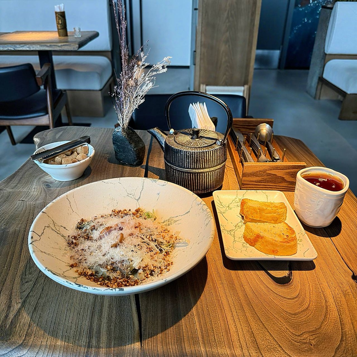 С чаем (190 ₽ за чайник) и двумя ломтями хлеба (50 ₽) обед обошёлся в 960 ₽.