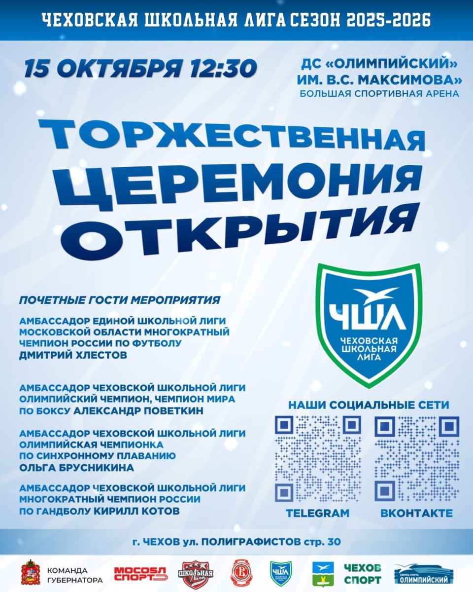 15 октября в 12:30 на большой спортивной арене Дворца спорта «Олимпийский» им. В.С. Максимова» пройдет торжественная церемония открытия Чеховской школьной лиги спортивного сезона 2025/2026! 🎆