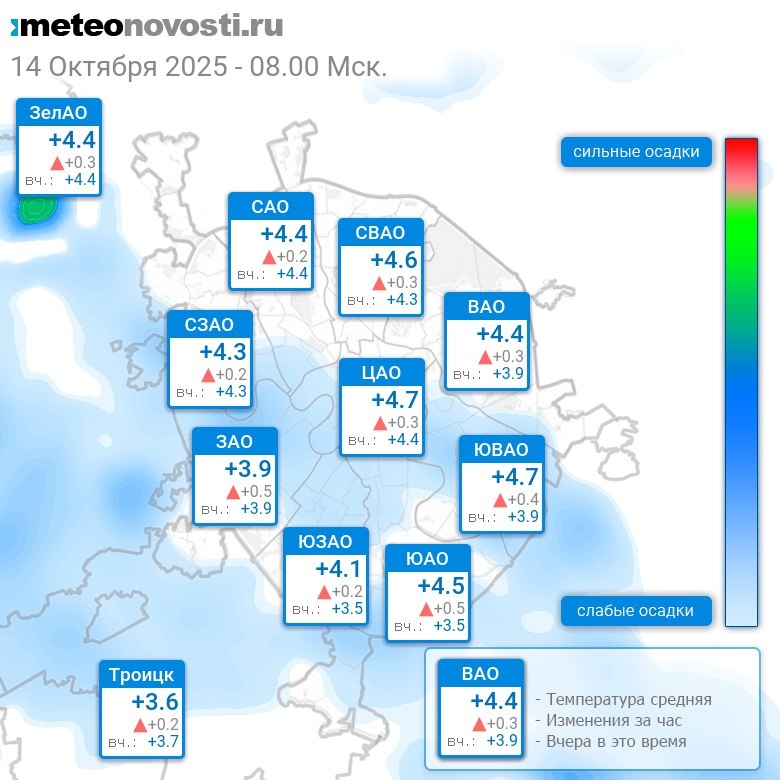 В 8:00 в Москве было от +3.5°C до +4.9°C, средняя температура +4.4°C #погода #Москва #осень #температура #14октября #вторник Перейти на сайт Прогноз погоды на 14 дней