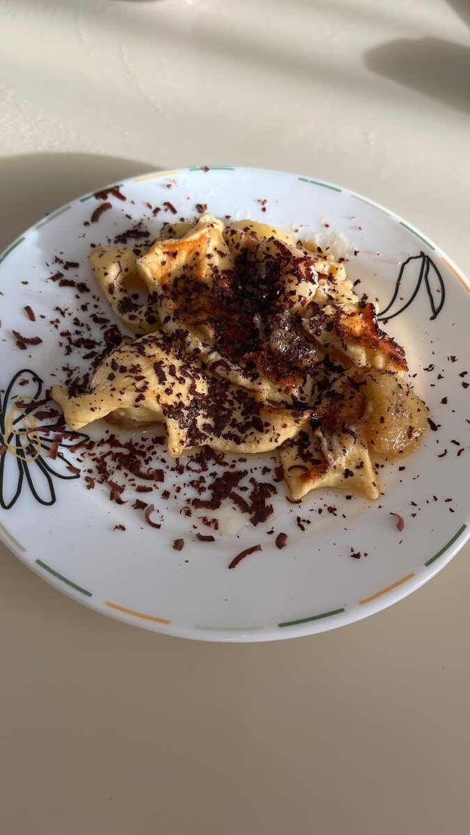 Нарезаем банан колечками, растапливаем на сковороде сливочное масло и выкладываем банан. Взбиваем яйца, добавляем крахмал, тщательно перемешиваем, затем добавляем сливки 20%. Заливаем бананы. Готовим под крышкой на среднем огне. При подаче посыпаем тертым шоколадом. У меня на 2 яйца 1 ч.л. крахмала и 20-30 гр сливок
