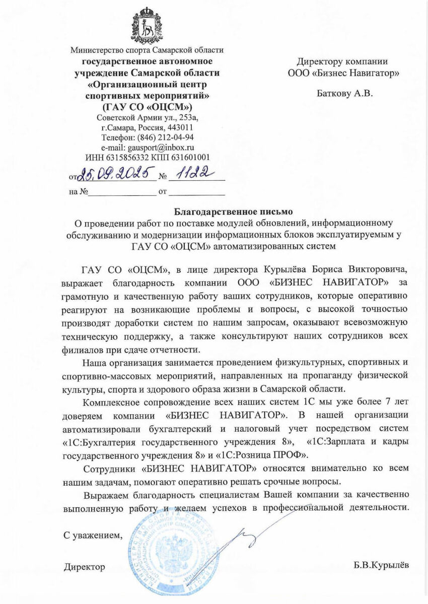 Получили новый отзыв в нашу копилку ☺️ Благодарим партнеров ГАУ ЦО ОЦСМ (Организационный центр спортивных мероприятий Самарской области). 📄Комплексное сопровождение всех наших систем 1С мы уже более 7 лет доверяем компании «Бизнес Навигатор». В нашей организации автоматизировали бухгалтерский и налоговый учет посредством систем «1С:БГУ», «1С:ЗКГУ», «1С:Розница ПРОФ». Сотрудники «Бизнес Навигатор» относятся внимательно ко всем нашим задачам, помогают оперативно решать срочные вопросы. С высокой точностью производят доработки систем по нашим запросам, оказывают всевозможную техническую поддержку, а также консультируют наших сотрудников всех филиалов при сдаче отчетности.