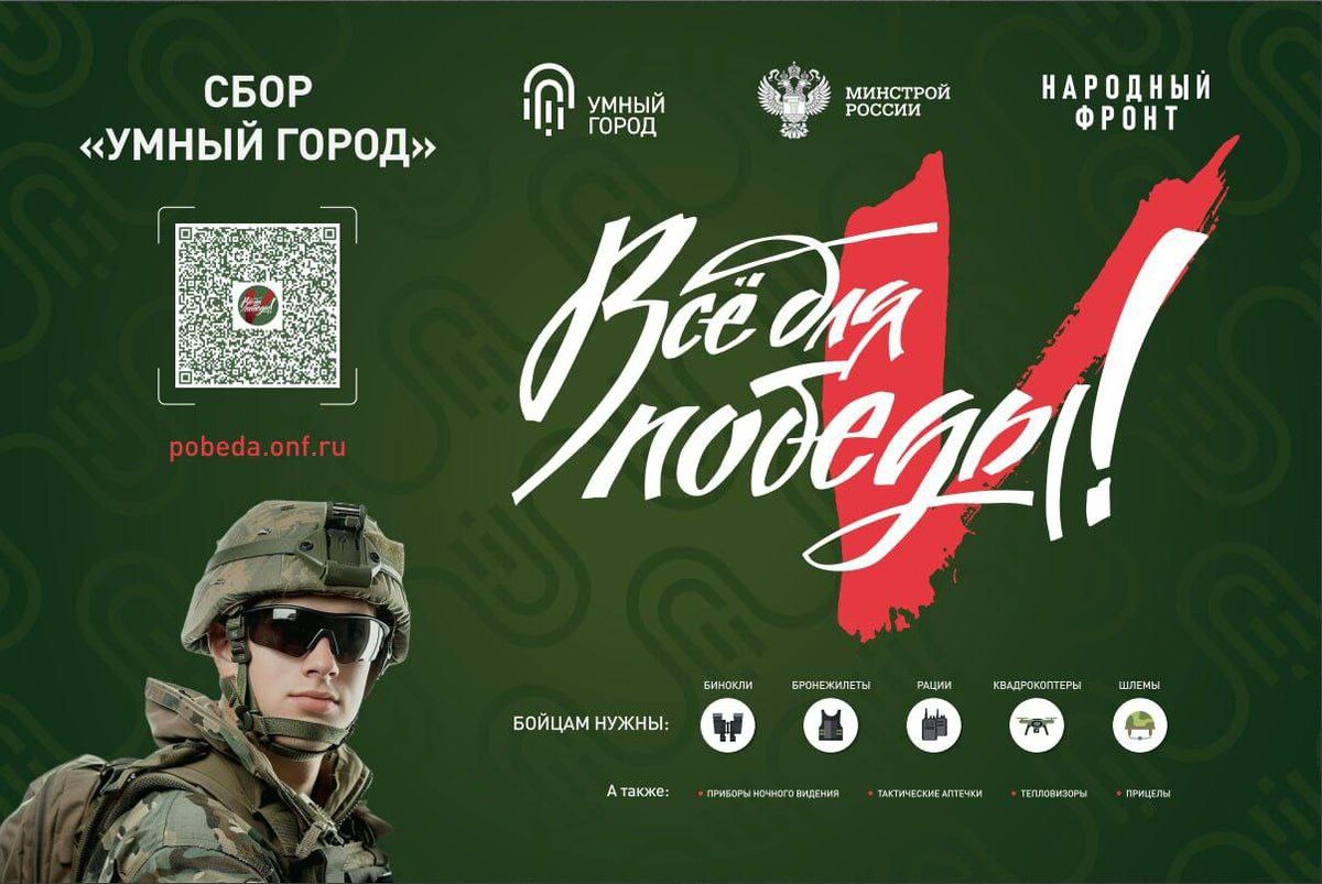 🫡🫡 Ведется сбор гуманитарной помощи Для поддержки участников СВО и мирного населения Донбасса Общероссийский народный фронт запустил проект «Все для Победы Сбор в рамках акции «Умный город» проводят по трем основным направлениям: ⚪️на закупку квадрокоптеров, тепловизоров, средств связи, бронежилетов, защитных шлемов, генераторов, компьютерной техники, индивидуальных тактических аптечек, мягких носилок, спальных мешков, рюкзаков, средств обогрева, комплектов вещей, маскировочных сетей; ⚪️для передачи новым регионам программного обеспечения и оборудования для реализации проектов «Умный город»; ⚪️сбор писем со словами поддержки военнослужащим. Принять участие в проекте «Все для Победы» и оказать благотворительную помощь солдатам и жителям республик, пострадавших от военных действий, может любой желающий. ⭐️ На портале Всё для победы рассказано, как перечислить деньги, где принимают вещи, что требуется бойцам. Здесь же можно узнать, как грузы доставляются адресатам.