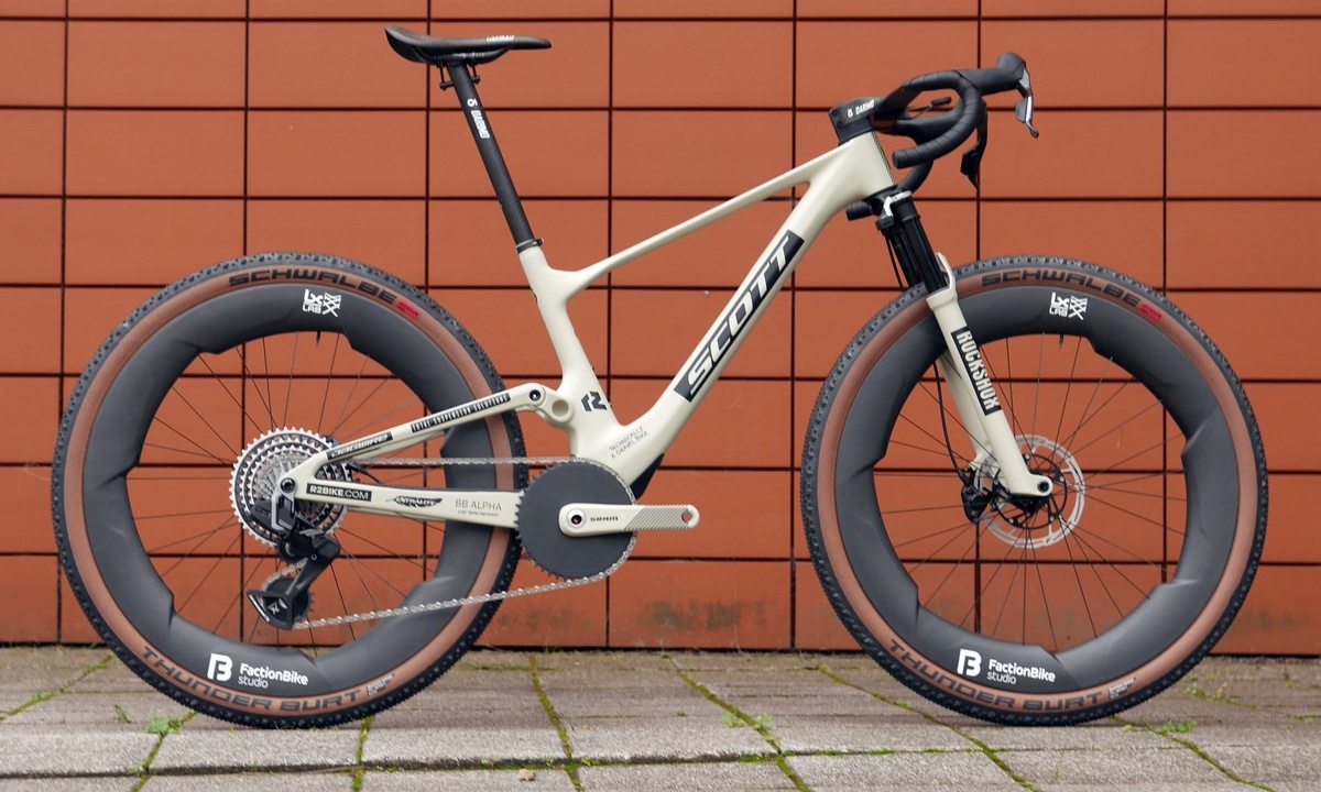 Еще один эксперимент от велоэнтузиаста Дангерхольма – двухподвес Scott Spark со сверхширокими аэро-гравийными колесами и рулем-бараном. В этом случае гравийный характер байка задают в первую очередь сверхширокие концепт-колеса Faction и интегрированный кокпит Darimo Nexum. Все остальное – чистый КК: автоматическая подвеска RockShox SID Ultimate Flight Attendant спереди и сзади, лёгкая рама и гоночная геометрия. Вес здесь был не приоритетом, но мелкие детали все равно из топ-сегмента – например, ультралегкий кронштейн под велокомп Alpitude Stelvio Correto, который когда-то называли самым легким в мире. Трансмиссия – гравийная SRAM Force AXS XPLR, с аэрозвездой Garbaruk на 46 зубьев (со смещением 1мм) и кассетой 10-46T. Передаточный диапазон 460% – почти как у кантрийного сетапа 34T х 10-52, с которым этот Spark обычно идет «в стоке». В итоге получается не ультралегкий, но безумно интересный гибрид – технически гравийник, а по духу и возможностям – чистокровный кросс-кантрийный байк.