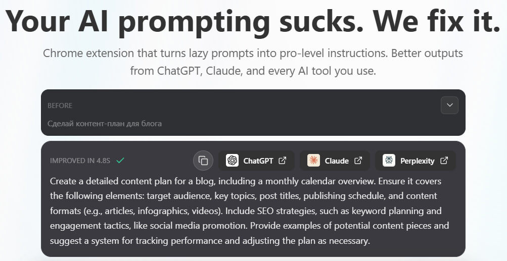 Your AI prompting sucks... 😏 ✍️ От качества промпта многое зависит. Плохой запрос → посредственный ответ. Prompt Sloth решает эту проблему очень просто. Пишите свою "сырую" фразу и сервис сам превращает её в промпт высокого уровня. Добавляет контекст, роль, цели, ограничения. Предлагает промпты специально заточенные под логику топовых моделей (ChatGPT, Claude, Perplexity) https://promptsloth.com/ - Это как нанял себе личного prompt-инженера 🤖