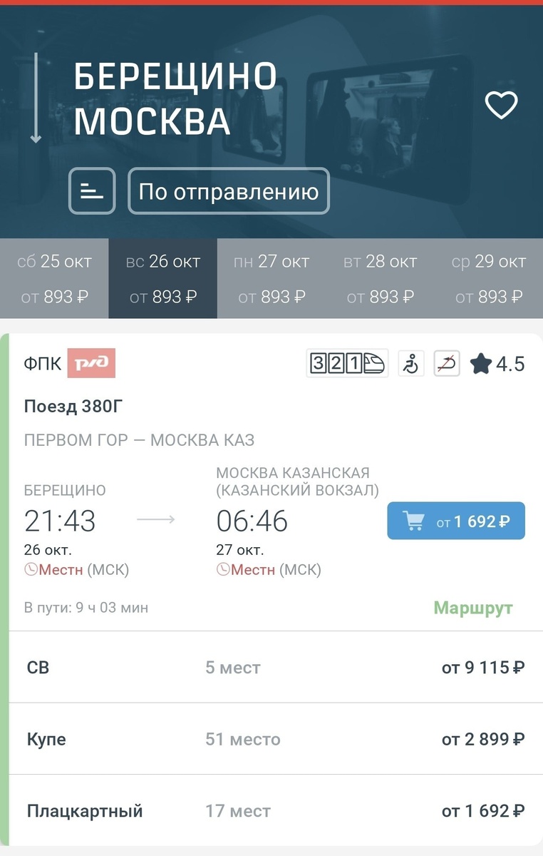 🚂С 26 октября смещается время отправления поезда 380 от Берещино. Сейчас состав отходит в 20:58, а будет в 21:43. Из Сарова поезд отправится в 19.35. Время прибытия в Москву останется прежним - 6:46.