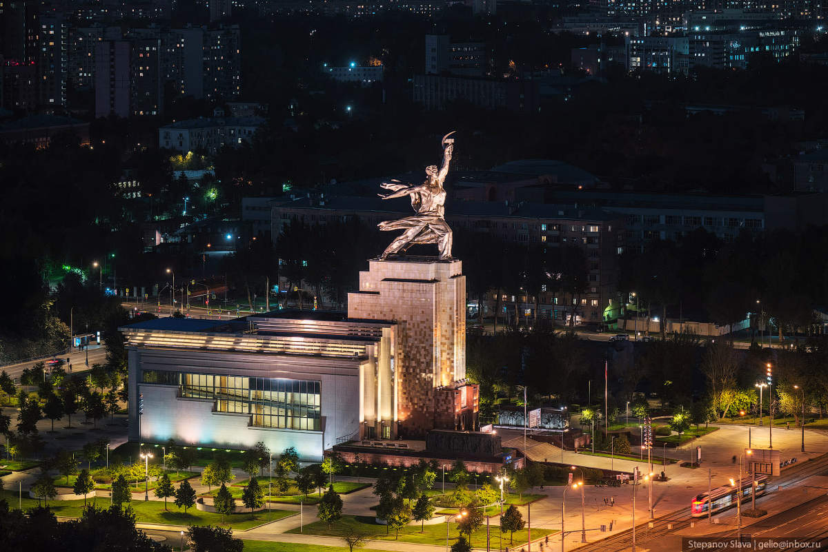Советские «Рабочий и колхозница» получил главный приз на выставке и стали одним из трёх советских колоссов — наряду со скульптурами «Родина-мать» и «Воин-освободитель». Сейчас скульптура находится в Москве, на проспекте Мира, рядом с северным входом на ВДНХ. 1. Общая высота всей композиции с постаментом — 30 метров. Она была выполнена из нержавеющей стали, что придавало ей блеск и долговечность. 2. Фигуры рабочего и колхозницы, соединённые единым жестом, олицетворяют единство труда и сельского хозяйства, а также стремление к строительству коммунистического общества. Рабочий держит молот, а колхозница —
