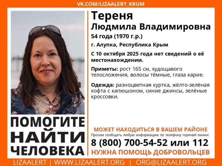 С 10 октября 2025 года нет сведений о её местонахождении. Приметы: «Просим сообщать любую информацию по телефону горячей линии: 8 (800) 700-54-52 или 112. Возможно, женщина находится в вашем районе», – призывают волонтёры. Для организации поисков также требуется помощь добровольцев. Читайте новости Крыма первыми в нашем Telegram-канале и даже когда не работает мобильный интернет в национальном мессенджере MAX.
