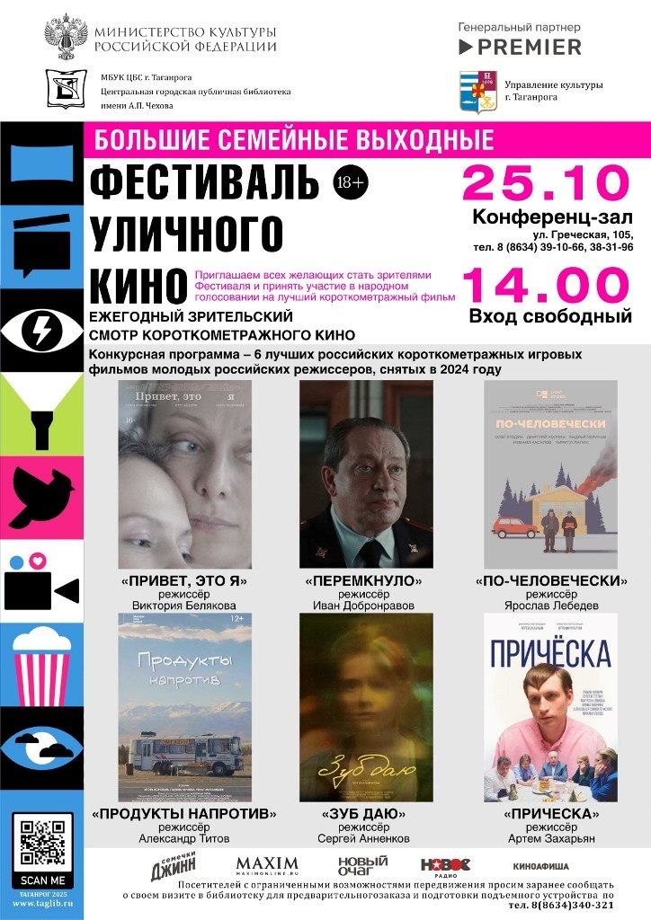 25 октября Чеховская библиотека Таганрога станет площадкой для XII Всероссийского фестиваля уличного кино. Зрителей ждёт бесплатный показ шести лучших короткометражных фильмов, которые были отобраны из более чем 1400 представленных работ.