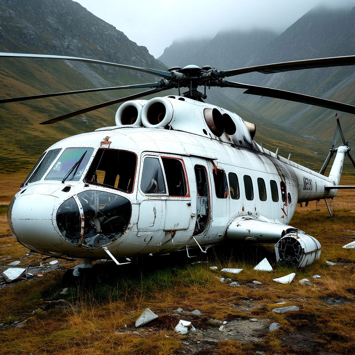 Больше никакой информации о той катастрофе нет. Вернее не было, до вчерашнего дня. Когда с утра мне позвонил один мой знакомый друг ©, горный гид, и попросил о встрече. Сказав, что у него есть очень странные сведения и пропавшем вертолете. Вместо сведений, он принес мне фотографии. Белый Ми-8, с разбитыми лопастями и помятым фюзеляжем, лежит, накренившись на бок и хорошо виден, так как снят с близкого расстояния. Изображение посечено мелкими косыми полосками дождя. Нет никаких сомнений в том, что это он. Я сверил бортовой номер, четко отпечатанный и попавший в кадр, со сводкой происшествий.