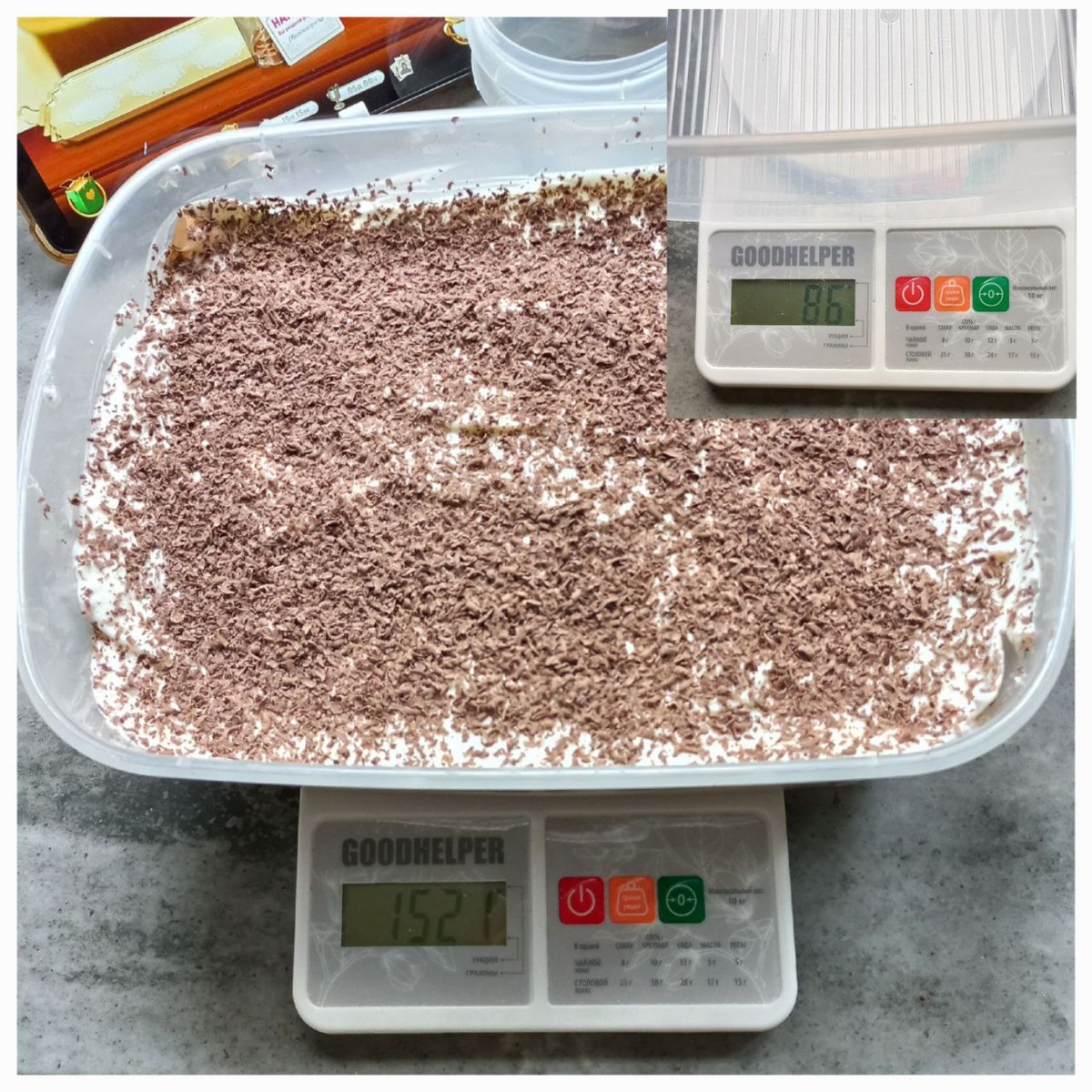 Я неправильно вставила фото в коллаж, чтобы показать вес готового продукта (~1,5 кг), который получается из 200 г савоярди, 500 г сливок и 500 г маскарпоне