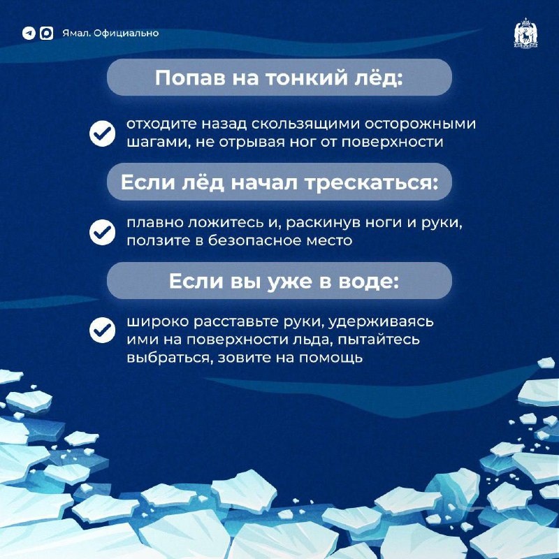 Сезонная опасность на Ямале ⛔ С приходом осенних морозов на реках образуется первый, крайне опасный лёд. Снег скрывает его реальную толщину, он выглядит прочным — и, кажется, можно легко перейти водоём. Но это обманчиво: только в прошлом году в период ледостава в округе погибли четыре человека. 🔵 Особый контроль — детям Впереди осенние каникулы, и у детей будет больше свободного времени. Задача взрослых — провести с ними беседы и не допустить игр у воды. 🔵Ответственность Выход на неокрепший лёд грозит предупреждением или штрафом до 1500 рублей. За выезд на лёд на транспорте — штраф от 2000 до 5000 рублей. 🔵 О том, как вести себя, если беды избежать не удалось, — смотрите в карточках. 🐻❄️ ЯМАЛ. Официально | Подписаться