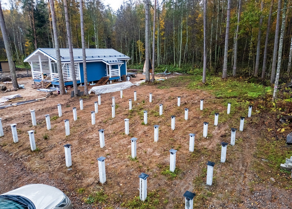 Заехали на строительство одноэтажного каркасного дома в КП «Приозерье», Выборгский р-н, На участке уже смонтирован свайно-забивной ЖБ