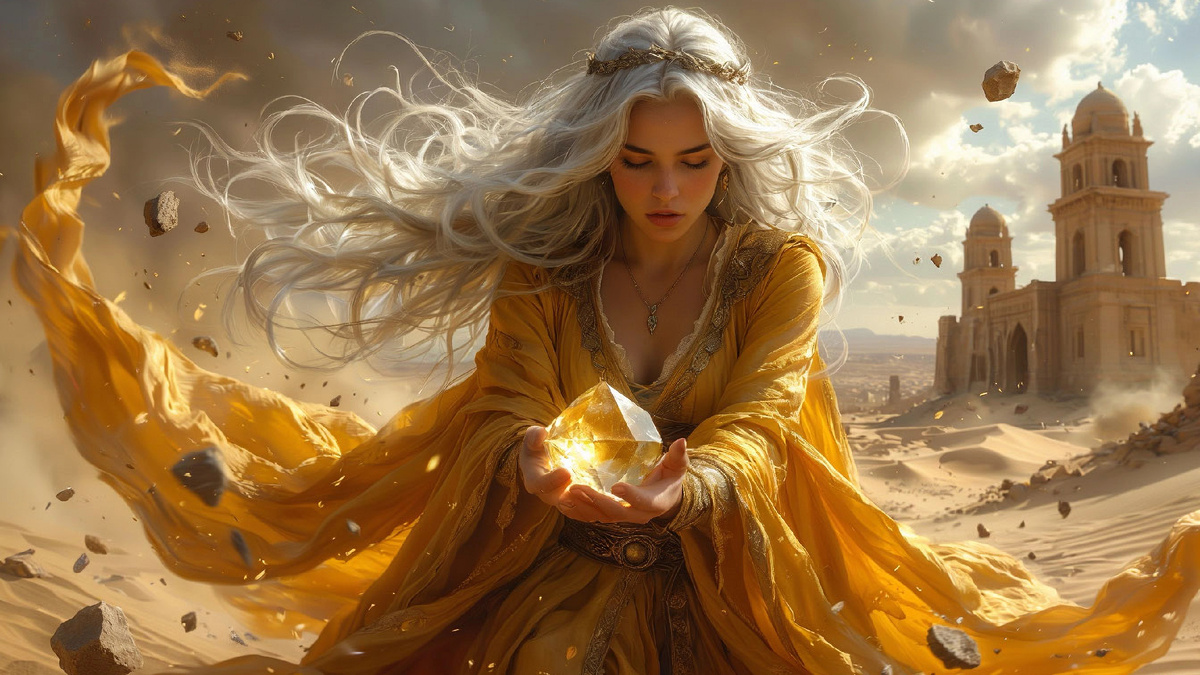 Амелия медленно опустилась на колени, не отрывая взгляда от загадочного создания. Песчаный дух, словно прочитав её мысли, начал кружиться вокруг принцессы, создавая маленький вихрь из золотистой пыли.