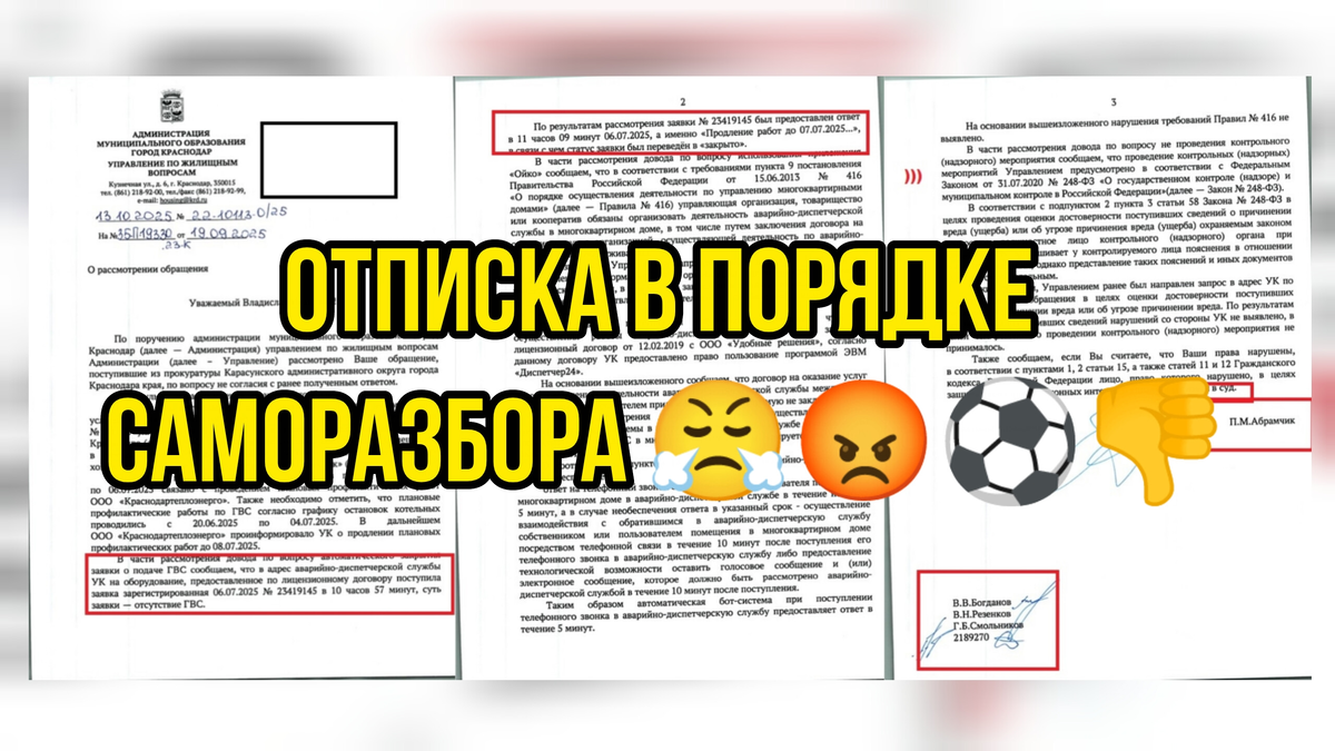 Поводом для данного обращения явилась полученная мною 13.10.2025 отписка начальника управления по жилищным вопросам администрации г. Краснодара П.М. Абрамчика (исх. №22-10113О/25), которая является наглядным подтверждением сложившейся порочной системы «саморазбора», когда чиновник, чьи действия и бездействие обжалуются, сам себя «проверяет» и, естественно, нарушений не находит.
