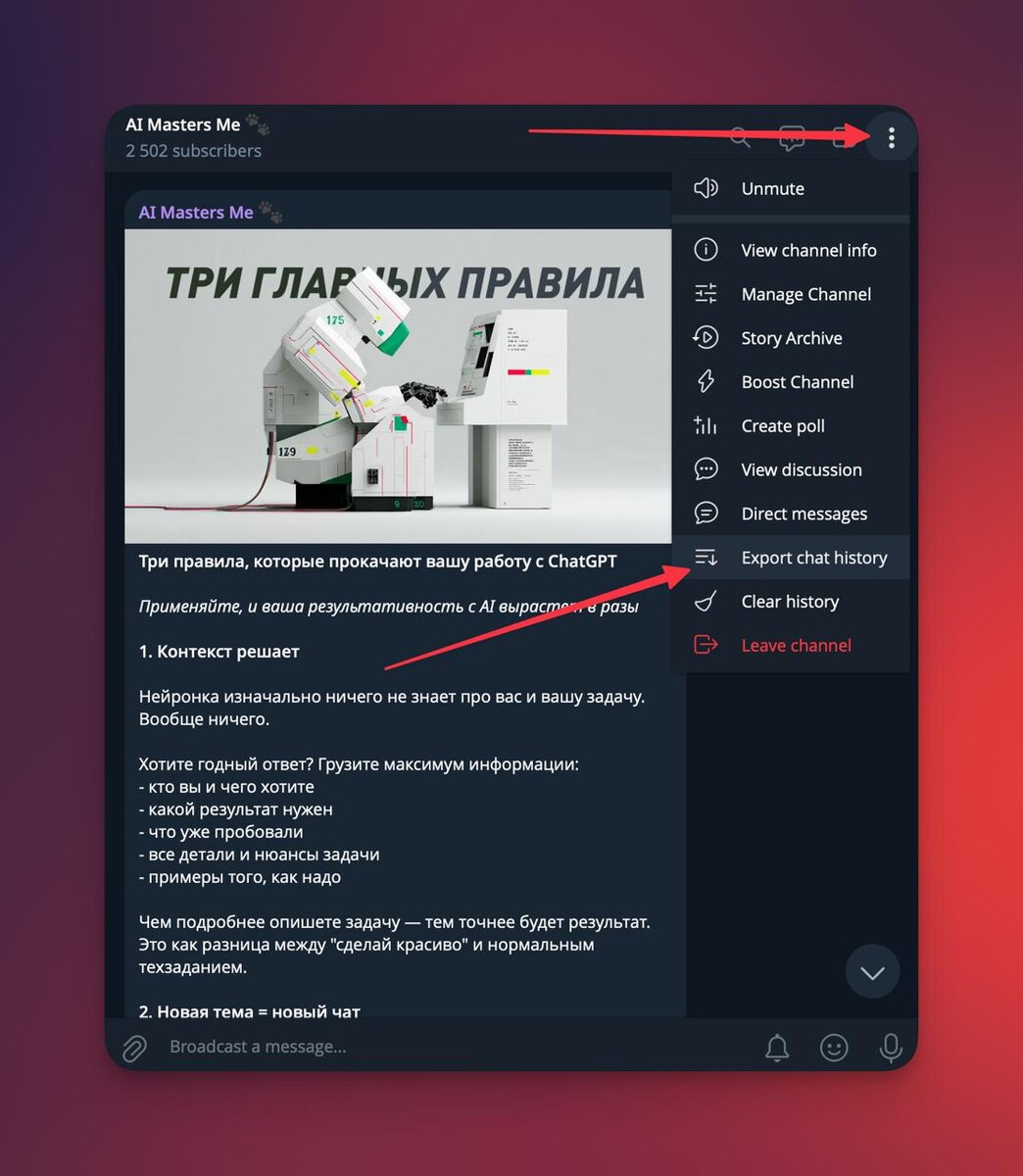 🤯 Как разобрать мессенджер с помощью AI 🚀 Устали от бесконечных чатов в Telegram? Если у вас десятки рабочих групп, где информация копится неделями, а потом приходится тратить часы на поиск важного решения или выяснение конфликтов, есть решение. 💡 За 10 минут можно получить краткую выжимку всей переписки. Для этого понадобится десктопная версия Telegram (на Mac - Telegram Light). 1. Экспортируйте историю чата: зайдите в нужный чат, нажмите три точки сверху справа, выберите "Экспортировать историю чата". ✅ Не забудьте отключить экспорт картинок, нужны только тексты. ✅ Выберите конкретный период, чтобы файл не был слишком большим. ✅ Если только что установили приложение, придется подождать сутки. 2. Откройте HTML-файл в браузере, скопируйте весь текст. 📄 Продолжение следует...