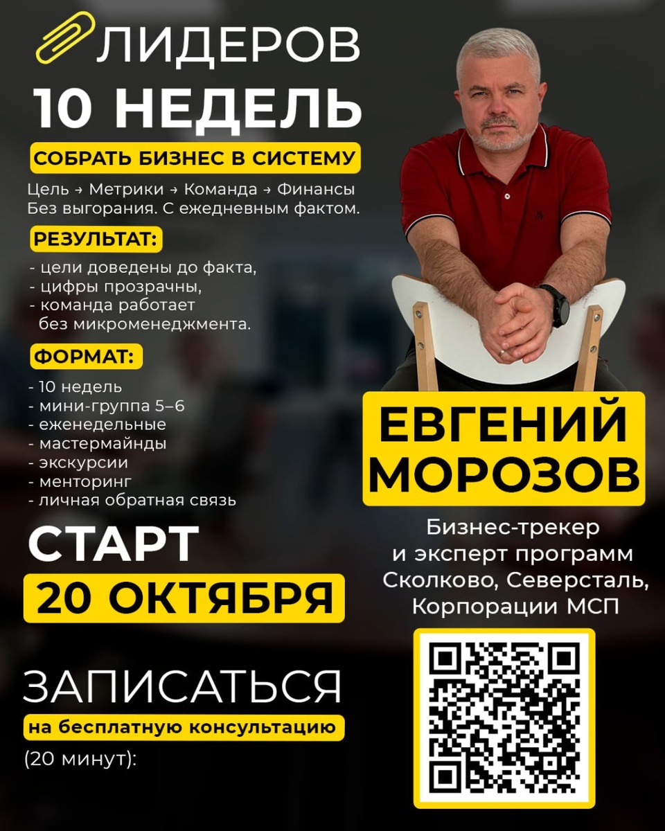 Скрепка лидеров - 10 недель, которые собирают ваш бизнес в систему. Вы же знаете это состояние: всё вроде работает - клиенты есть, команда есть, продажи идут. Но внутри ощущение, что бизнес живёт на вашей личной энергии. Стоит чуть отпустить - и всё начинает тормозить. Это значит, что у бизнеса нет системы, есть вы. А значит - нет роста без вашего участия. 📌 Что выстроим на курсе «Скрепка лидеров» ⏺️Цели и фокус. Не “увеличить выручку”, а конкретный OKR: от X → к Y до даты. ⏺️Цифры. Управленческий учёт, КМБ (контроль моего бизнеса), короткий ДДС, план-факт. ⏺️Команду. Как делегировать результат, а не действия. ⏺️Операционку. 10-недельные циклы, короткие совещания, прозрачные метрики. ⏺️ Владельца. Возвращаем стратегическое мышление и время на развитие. 📌 Формат 10 недель. Мини-группа 5–6 человек. Раз в неделю - встреча, разборы, задачи, обратная связь. Экскурсии в бизнесы участников, менторинг в парах и личные консультации. Вы не просто слушаете - внедряете систему каждую неде
