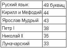 В русском языке было 49 буквиц. Затем Кирилл и Мефодий упростили до 44 буквиц; Ярослав Мудрый убрал ещё 1 буквицу, осталось 43; Петр I изничтожил до 38 буквиц; Николай II до 35 буквиц; Луначарский сократил ещё больше и ввёл букву «Ё», осталось 33 буквы. Также Луначарский убрал образы, речь стала безОБРАЗной. Исчезла структура словопостроения – откуда, что и как. 1. Речь — развитие народа