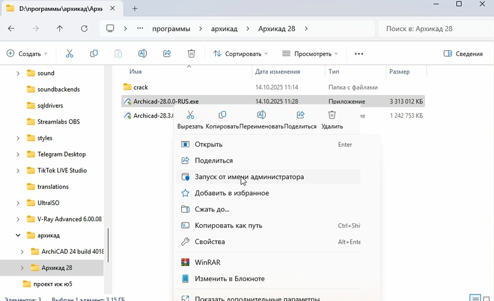 1. Скачиваем программу 2. Запускаем первый файл от администратора, и выбираем куда установить (я выбрала тот же путь, где у меня и прошлая версия Архикада). 3. Далее устанавливаем второй файл "Archicad-28.3.0-Update-RUS.exe" также запустив от администратора. Путь выбираем в туже папку куда установили первый файл. 4. Когда все установлено, открываем папку "Crack" 5. И здесь копируем все файлы 6. Вставляем в папку, где сейчас установлен Архикад 7. Сейчас можете открывать программу , все работает. Если остались вопросы, пишите)