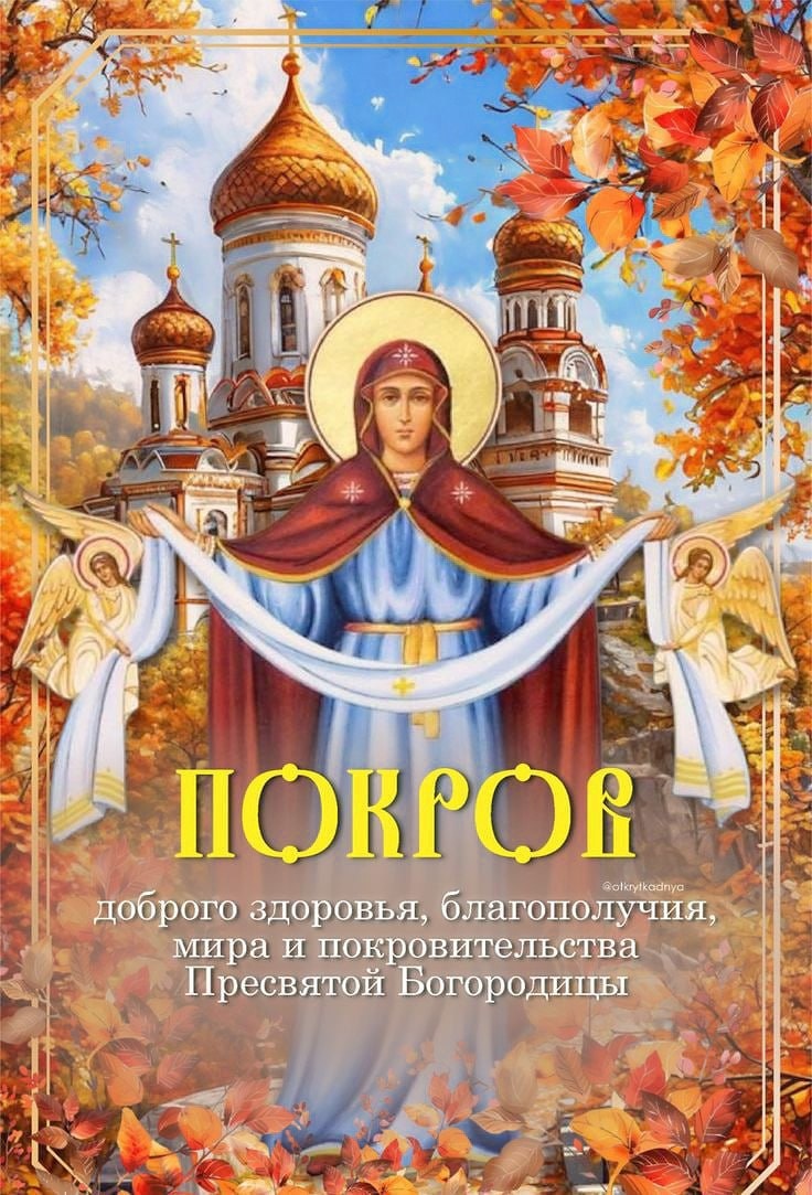 В годину тяжких бед, в смертельный год, Когда сникает силовик плечистый, Вдруг весь народ нутром осознает, Что нас хранит один Покров Пречистой. Как в Церкви Таинство Святых Даров Невидимо, но ощутимо нами, - Пречистой Богородицы покров Раскинут над житейскими волнами. Покров - сильней ракетного щита, Всего, что может человек создати. Земная жизнь - ничтожная тщета, Когда с ней нет небесной благодати. И потому, хоть дел невпроворот И груз забот сгибает тяжко плечи, - Повсюду на Руси пылают свечи. И вновь с надеждой молится народ. Покров, Покров над Русскою землёй! Дано Руси небесное гражданство - Пока сердца не сделались золой, Покуда в нас молитвы постоянство. А если мы не те - в смертельный год, Когда замолкнет оптимист речистый, - Пусть осознает до конца народ, Что нас хранил один Покров Пречистой. Протоиерей Андрей Логвинов С ПРАЗДНИКОМ!🙏