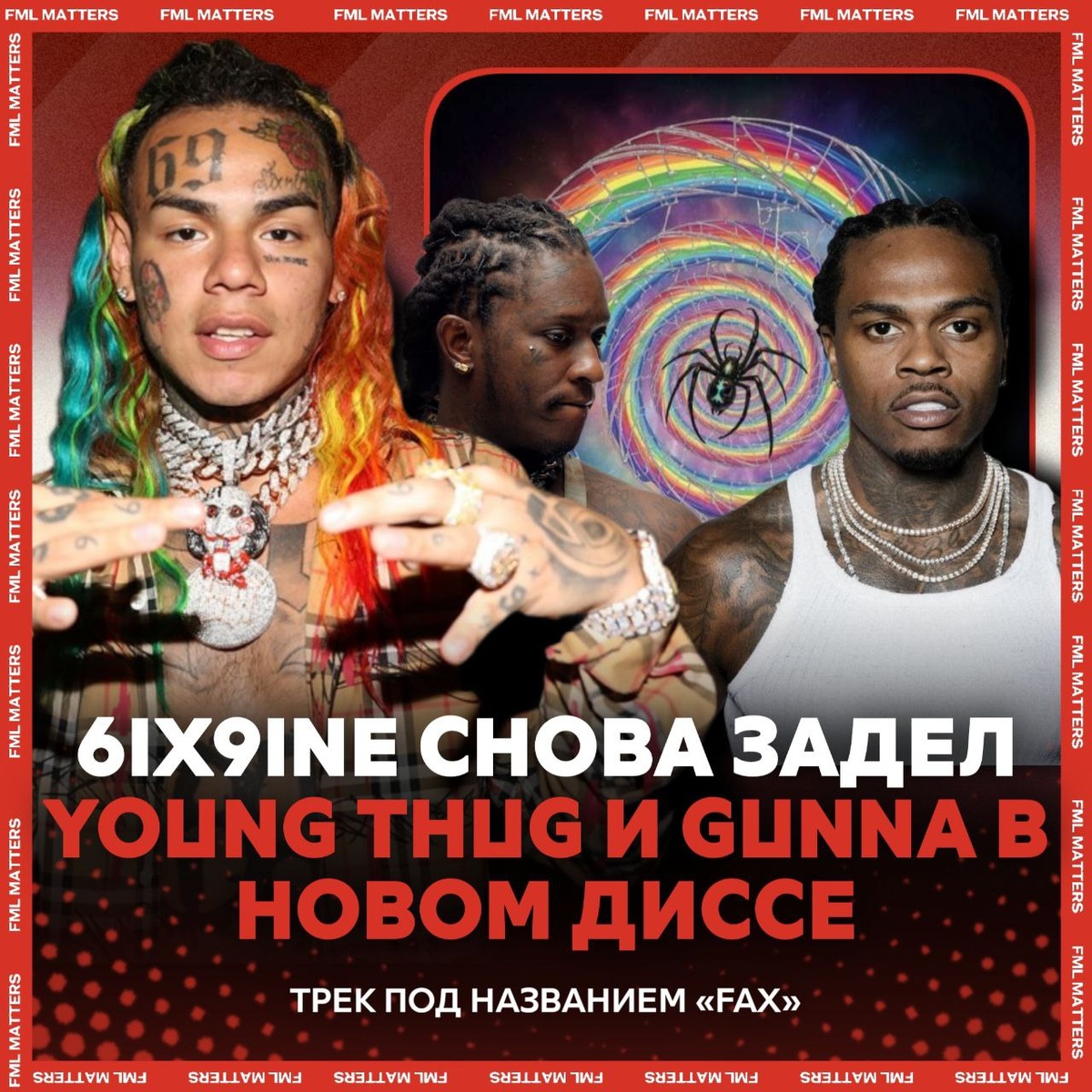В ответ на пост 🤬 6IX9INE СНОВА ЗАДИССИЛ YOUNG THUG и GUNNA! Рэпер выпустил трек под названием «FAX», в котором снова атакует Тагга и Ганну, называет их «крысам» и обвиняет в том, что они сдавали людей властям: «Говорят, н*ггеры хотят меня убить, а я все еще живу хорошо. Рэперы умирают каждый день, а я все еще живу хорошо. Если я крыса, то и вы крысы, разница лишь в том, что я не черный. Маленький паучок забрался по водосточной трубе, пришли федералы, и он сдал своих людей. Рэперы знают, я видел, как змея превращается в крысу. Эй, Ганна сделай это, Ганна сделай то. Заткнитесь, вы же крысы» Послушать трек можно в FML MUSIC 💀 FML MATTERS