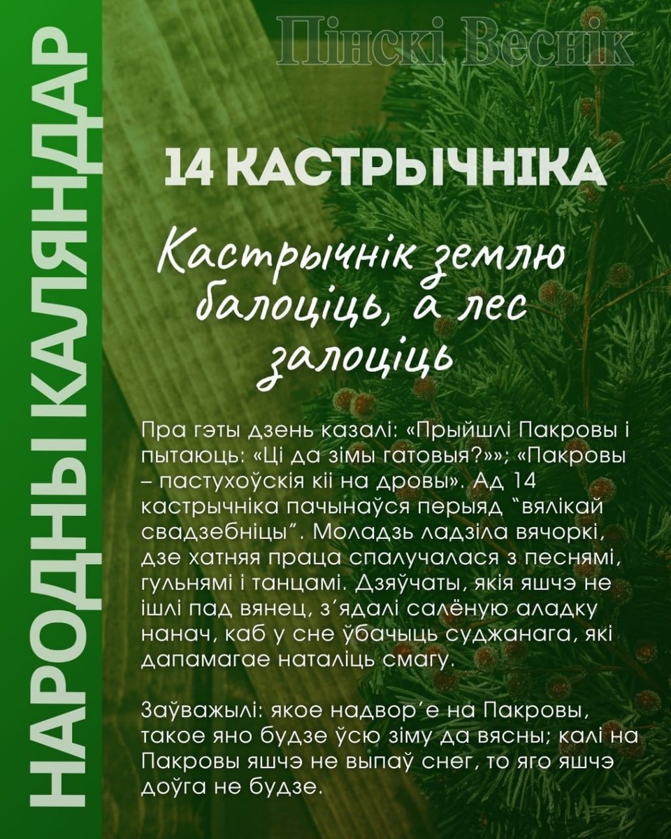 1️⃣1️⃣1️⃣1️⃣5️⃣1️⃣2️⃣ 1️⃣1️⃣1️⃣3️⃣1️⃣5️⃣1️⃣1️⃣ 🔵14 кастрычніка Пра гэты дзень казалі: «Прыйшлі Пакровы і пытаюць: «Ці да зімы гатовыя?»»; «Пакровы – пастухоўскія кіі на дровы». Ад 14 кастрычніка пачынаўся перыяд “вялікай свадзебніцы”. Моладзь ладзіла вячоркі, дзе хатняя праца спалучалася з песнямі, гульнямі і танцамі. Дзяўчаты, якія яшчэ не ішлі пад вянец, з’ядалі салёную аладку нанач, каб у сне ўбачыць суджанага, які дапамагае наталіць смагу. Заўважылі: якое надвор’е на Пакровы, такое яно будзе ўсю зіму да вясны; калі на Пакровы яшчэ не выпаў снег, то яго яшчэ доўга не будзе. #народныкаляндар 📍📍@Пинский Вестник ЮТУБ | САЙТ| ИНСТ | ВК | ОК | ФЕ | TikTok Прислать новость