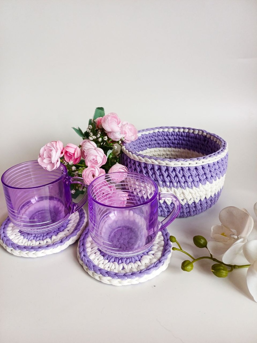 😁 😁😊😊😁😊😁😁 Чайный набор👇 ▪️Корзинка из трикотажной пряжи с деревянным дном, можно использовать под вкусняшки ▪️2 подставки под кружки из трикотажной пряжи ▪️2 кружки 💰1300